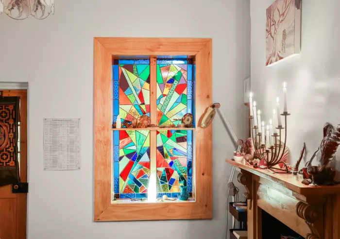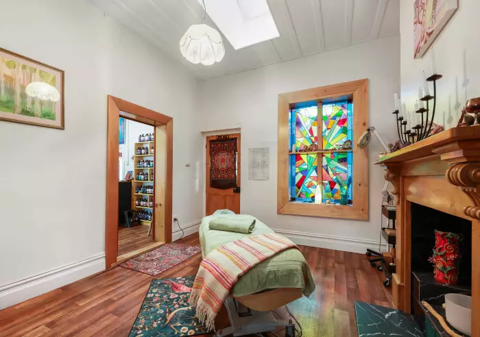 There are two more bedrooms currently used as office and massage/therapy room which has a decorative fireplace and the most stunning stain glass window with a pallet of rainbow colours.