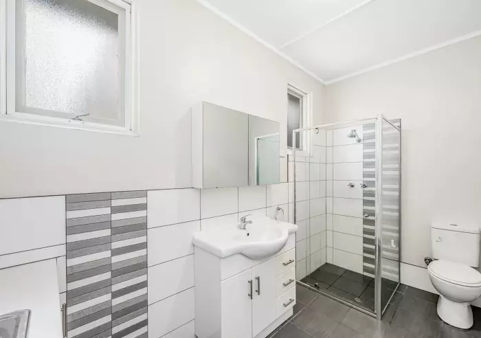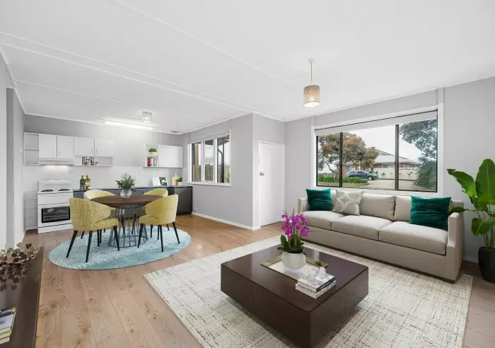 The kitchen shows off ideal features, with stylish two-tone cabinetry, electric cooking and large windows that flood the space with natural light. A split system air conditioner ensuring all year-round comfort, and a fresh paint job throughout the house to give the home a clean, modern feel.