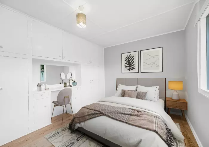 The main bedroom overlooks the peaceful backyard and includes wall-to-wall built-in storage, while the second bedroom features a built-in robe.